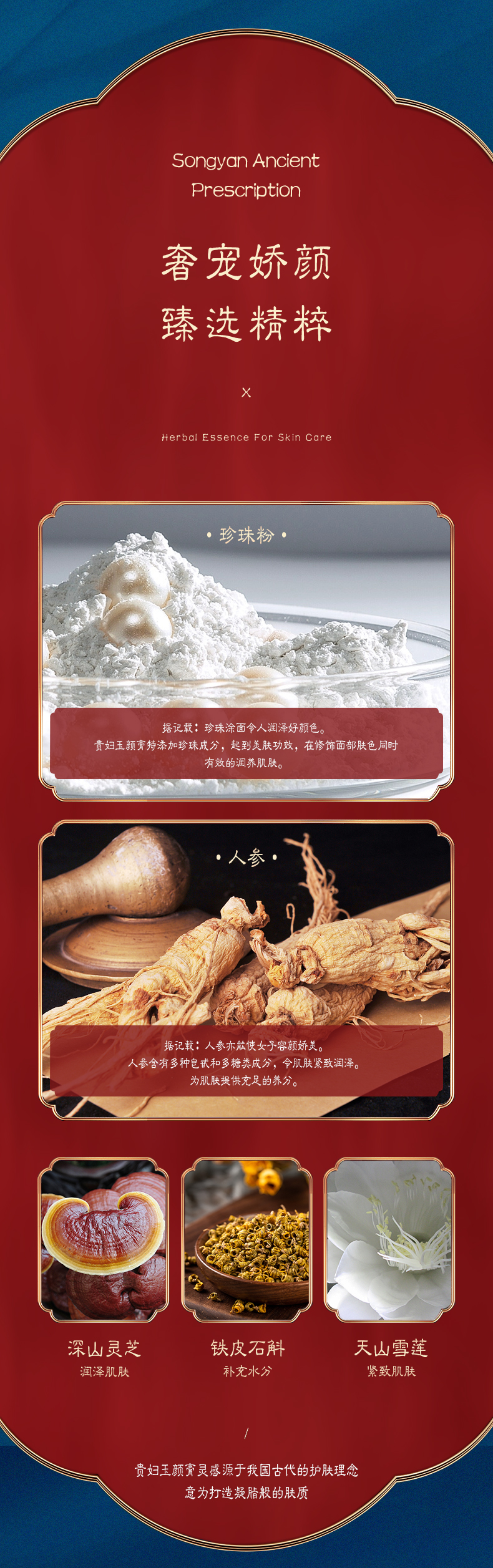 成分:霍霍巴籽油、角鲨烷、透明质酸钠、烟酰胺、红没药醇、黑灵芝提取物、金盏花花提取物、人参提取物、雪莲花提取物、积雪草提取物、芍药根提取物 、玫瑰花提取物、蜂胶提取物、牛蒡籽提取物、知母根提取物、铁皮石斛提取物、桔梗根提取物、连翘果提取物、珍珠提取物、莲籽提取物、忍冬花提取物、掌状海带提取物